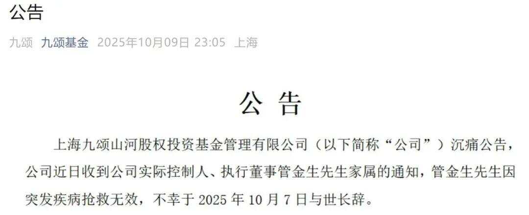 10月9日23时,上海九松山河股权投资基金管理有限公司(以下简称“九松基金”)发布公告称,近日收到实际控制人、执行董事关金生先生所属公司通知,关金生先生因抢救无效,突发疾病去世。不幸的是,他于2025年10月7日去世。 据九松基金介绍,关金僧作为中国安防行业的先驱者,一生专注于金融活动的变革和发展。 1988年,他创办了万国证券,开创了中国证券市场的多项先河,被誉为“中国证券教父”。他以深厚的专业素养和远见卓识,为行业培养了大批人才,为中国资本市场的规范化、国际化进程做出了贡献。 2016年,关金生创立了上海九松纱恩和股权投资基金管理有限公司持续致力于私募股权基金领域。他致力于推动现代科技和产业升级,为公司发展做出了巨大贡献。同时公告表示,关金生先生的去世不会影响公司的正常经营。目前,公司各项劳动活动和经营正常进行。在中国A股三十年的混乱历史中,关金生是一个不可避免的名字。他曾经是上海实力雄厚的“证券教父”。他一人创办了新中国第一家证券公司万国证券,却因“327国债事件”一夜之间跌落巅峰。关金生,1947年5月19日出生于江西省清江县(现樟树市)。 1965年考入上海外国语大学法语系,后又考入上海外国语大学法语系。赴比利时布鲁塞尔自由大学深造,获得法律和工商管理双硕士学位。 1988年创办万国证券。这家从千万元资本起家的保安公司,很快发展成为拥有数十亿元人民币的综合性公司,创造了中国保安行业的奇迹。 1990年上海证券交易所成立时,万国证券涉足交易规则、设备、创业培训等领域。 1992年,万国证券成为具有全球影响力的公司。原巨坛证券关金生、张国庆、原申银证券志东并称为“中国证券教父”。然而,关金生却在1995年的“327国债事件”中遭遇滑铁卢。1995年4月,关金成因此事件辞职。同年5月,关金生被捕。 1996年7月,申银万古合并成立申银万国证券公司。 1997年2月3日,上海市第一中级人民法院判处关金生有期徒刑17年。他于2003年从医用灯笼中释放出来,并于2015年公开展示了这一事件。2015年6月,关金生在参加论坛时面临“327”国债危机:“我这一生受了很多苦,受了很多苦,因为受了很多苦,我不想做我内心的骄傲和谨慎。接下来上级部门关于这件事,我们真的可以改变真相,扭转局面。”关金生说 互联网时代改变了信息不对称,类似于“327”国债危机的历史悲剧。今天完全避免了这场闹剧。 2016年,他创办上海九松山河基金公司,发起第三次创业,并主导设立中外合作平行基金、牵头设立新技术新材料基金公司。”关金生、九松山河基金、中外合作平行基金(平行基金)、中国工业园区等。模拟“327 事件”“327”是国债期货代码。 132元 1995年2月23日,财政部发布公告,“327”国债按148.50元兑付。做空者的判断完全错误,万国证券将遭受60亿元重大损失。为了保护自己的利益,关金生在收盘前8分钟大量透支并抛售国债期货,导致当天开仓的多头头寸全部变现。以国开行为代表的多头损失近40亿元。上同日前夕,上交所发布公告称,23日16时22分13秒后的所有交易均属不正常无效,“327”产品价格由会员协议确定。这使得万国证券的收购失败已经来不及了。 SI旺戈损失56亿元,处于亏损边缘。同年5月17日,中国证监会发布《关于在全国范围内暂停国债期货试点交易的紧急通知》。来源 |羊城晚报综合“九松基金”公众号、销售经济报、中国基金报