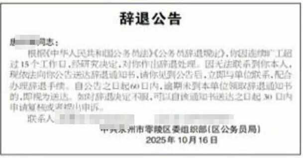 近日,湖南永州市一公务员连续旷工超过15个工作日,组织部门依法对其进行开除,引发关注。 10月17日,中共永州市零陵区委组织部向当地媒体发布《辞退公告》:“唐某某,根据《公务员法》和公务员辞退规定,经研究决定,你连续失业超过15个工作日,将予以辞退。” 《公告》称,“因您无法联系到我们,这关系到您个人的利益,本次驱逐通知已于今日公布,并已依法送达您,请您看到公告后立即与单位联系,配合采取解聘办法。” 编辑:王志涛