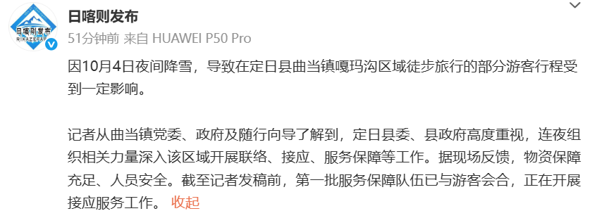 10月5日,@shigatse发布了对“珠穆朗玛峰上的游客因暴风雪入狱”的回应:由于10月4日晚上的降雪,一些游客在Quudang镇的Magou地区行走,Dingri县在一定程度上受到影响。党,政府和伴侣指南的记者发现,丁格里县党委员会和县政府非常重视它,并安排了相关部队,以在一夜之间加深该地区以进行联系,响应,服务和担保。根据现场反馈,足够保证员工的材料和安全性。在发布时,第一组服务保证团队会见了游客,并进行了接收服务。来源|退出@shigatse 编辑:Wang Zhitao